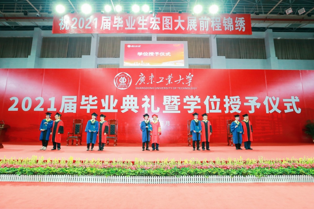 广工建校60多年,培养了40多万毕业生,很多毕业生已成长为科技拓路人、行业带头人、产业领军人。今年,又有一大批优秀学子从广工毕业,奔赴祖国建功立业。学校副校长余林宣读表彰2021届优秀毕业生的决定。学校学位评定委员会主席邱学青教授,学校学位评定委员会副主席杜承铭教授,学校学位评定委员会副主席余林教授,学校学位评定委员会委员谢胜利教授、黄少铭教授,为毕业生代表拨穗、授予学位。