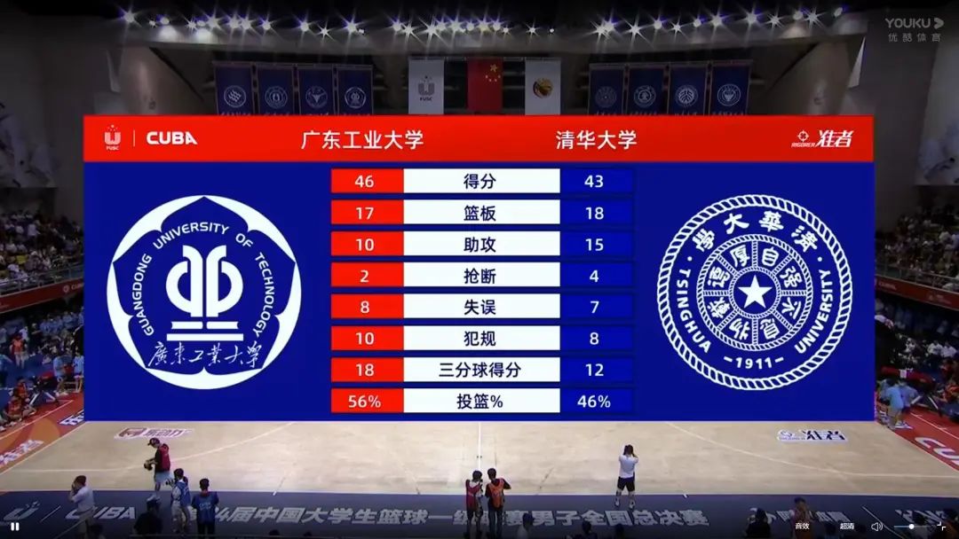 休息回来,清华的进攻又被防下,下一回合陈国豪又贡献一记大帽。进攻端多点开花卢健豪,刘康能利用防守反击和精准的三分球帮助广工保持着微弱的领先优势。强硬的防守代价就是犯规数的增加,陈国豪在连续两个防守回合领到犯规,个人累计四次犯规(累计五次犯满离场),无奈只能下场休息。暂停回来,虽然没有陈国豪广工依靠默契的团队配合和积极的前场篮板拼抢以及卢健豪的精准三分将领先优势拉大到7分,反观清华利用陈国豪下场休息的时间不断冲击内线,将比分迅速追了回来。在半场即将结束时邵炜昀命中压哨三分,灯亮球进,广工大拒绝平局进入下半场。上半场结束广工46:43领先3分。