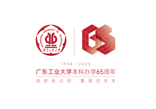 标识以吊机支架作为设计原型,体现支柱与构建两部分,整体形态显现为阿拉伯数字的“65”,平面与立体的多元组合理念代表现代设计潮流风向。叠搭形式彰显“强基底”,寓意学校本科65年办学的历史底蕴;阶梯层次体现“上台阶”,象征学校本科办学以来阶段性跨越的发展历程。标识在设计元素与结构上有较强的稳重感和工业感,契合我校工科办学特色;文字“1958-2023”,位于标识底部,直观展示学校本科办学时间。“广工红”的色调,与学校标识相统一,凸显学校培育社会主义建设者和接班人的红色底色。