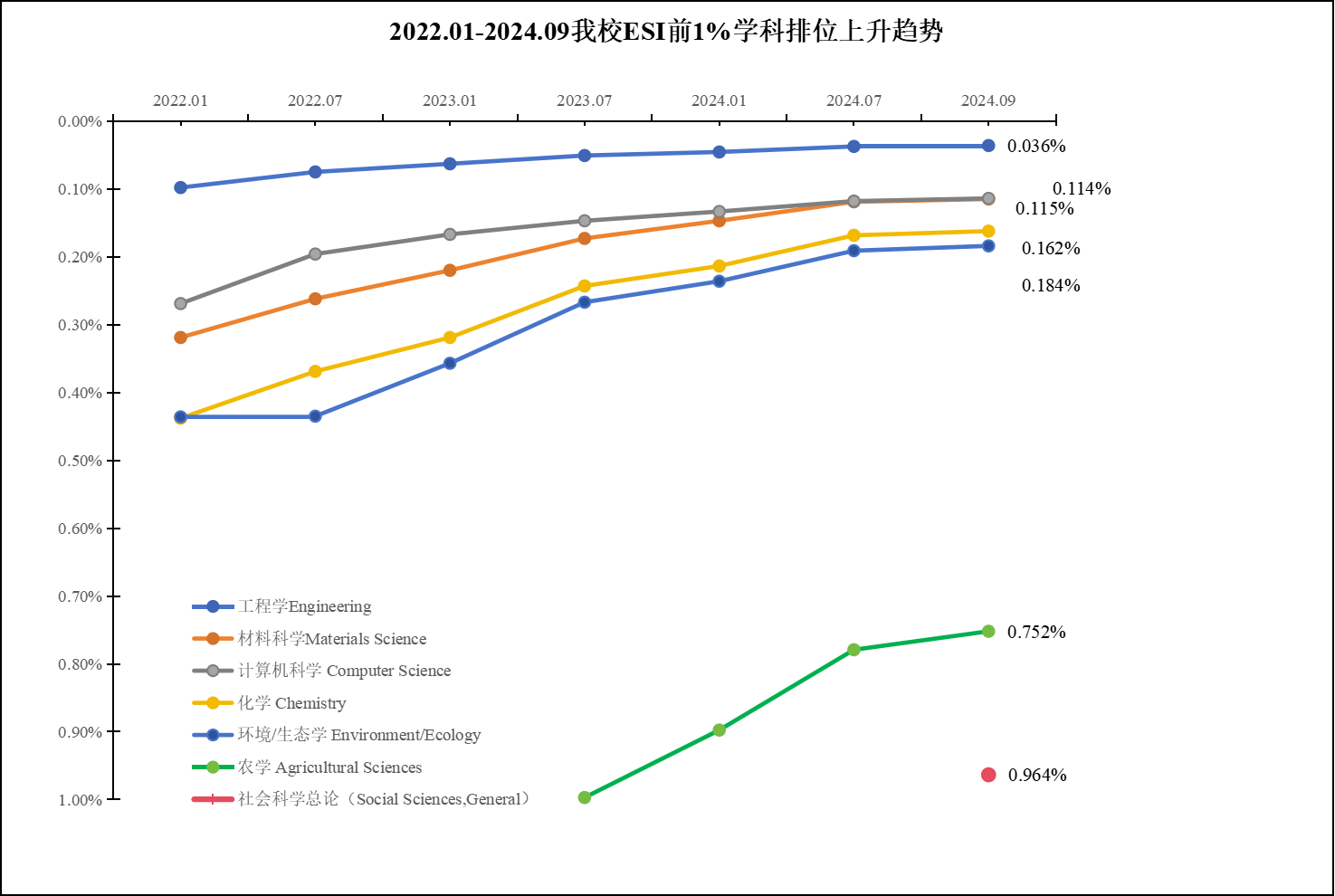 根据ESI 2024年9月12日最新数据显示,广工社会科学总论学科新晋ESI全球排名前1%,至此,学校有7个学科进入ESI全球排名前1%,其中工程学进入前0.3‰,ESI世界综合排名659位,较上一期提升21位。