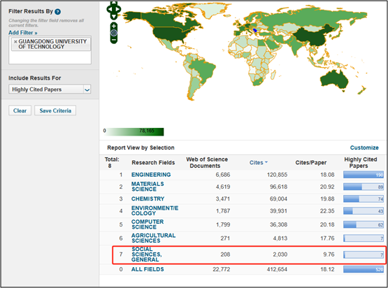 目前,广工进入ESI全球排名前1‰的学科有工程学,前1%学科有材料科学、计算机科学、化学、环境/生态学、农业科学、社会科学总论。支撑社会科学总论学科进入ESI全球排名前1%的学科所在的学院主要有管理学院、建筑与城市规划学院、经济学院、机电工程学院、计算机学院、土木与交通工程学院等。