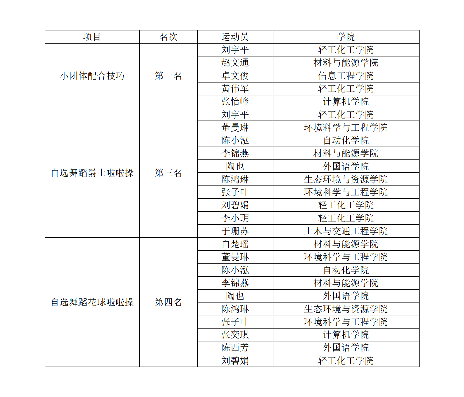 学校健美操啦啦操队全体队员以默契的配合和高超的技巧,展现了广工学子激扬青春的精神风貌和挑战自我、精益求精的竞技体育精神,最终取得了小团体技巧啦啦操第一名、自选舞蹈爵士啦啦操第三名、自选舞蹈花球啦啦操第四名和团体总分一等奖的优异成绩。这是继广东省第十一届大学生运动会啦啦操比赛斩获首金后,学校啦啦操代表队的再一次突破。