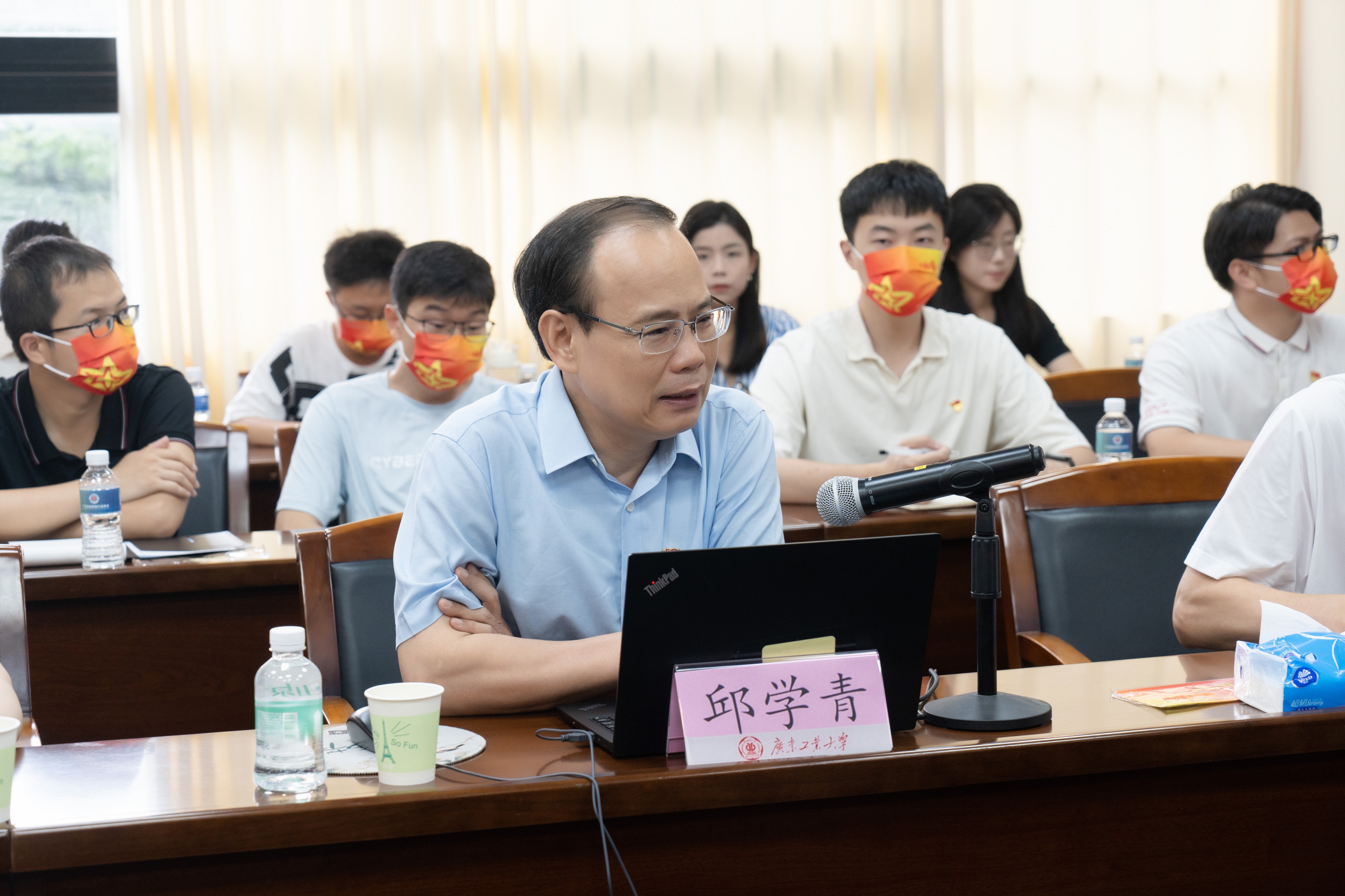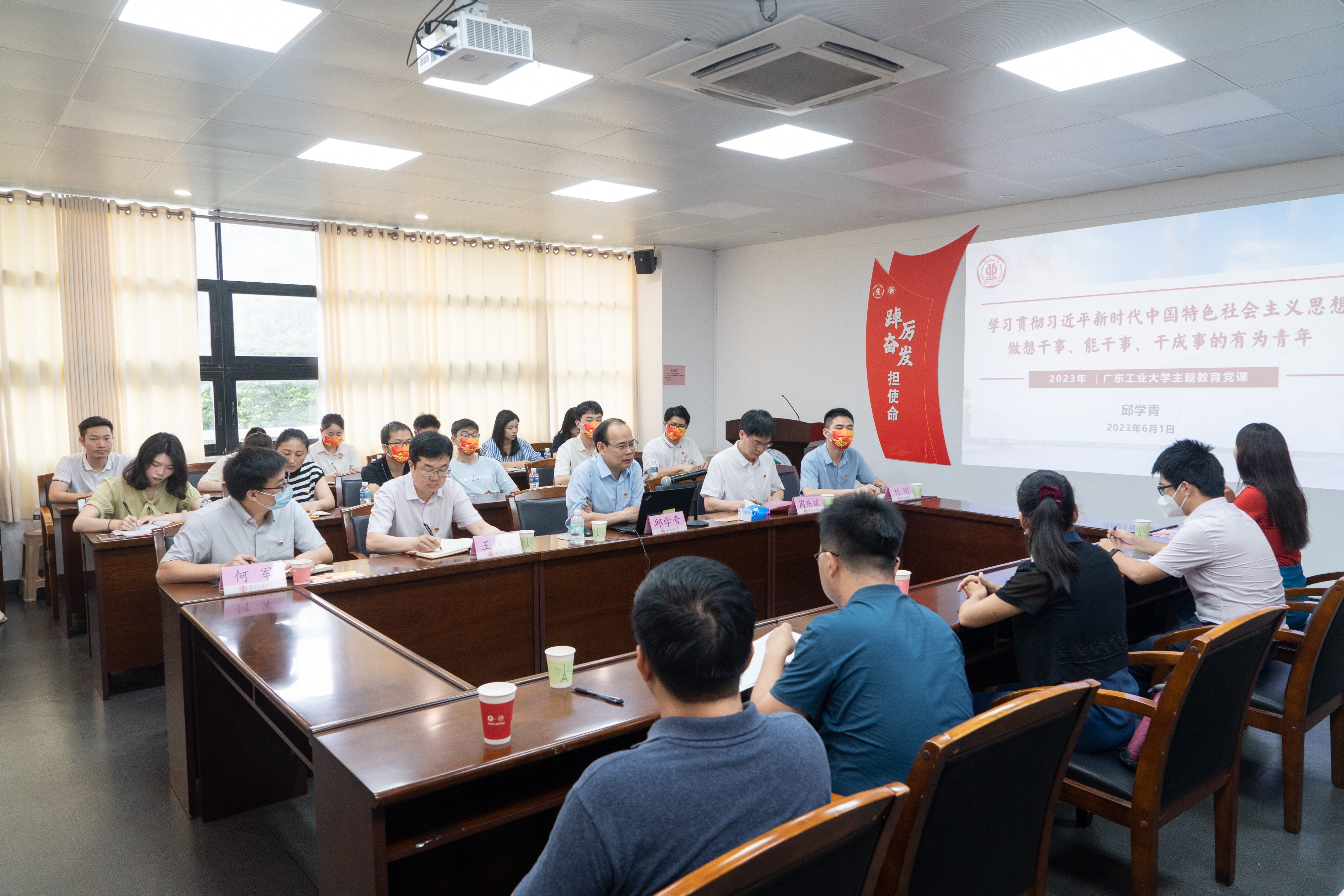 邱学青牢牢把握主题教育“学思想、强党性、重实践、建新功”的总要求,分别从“深刻领悟教育、科技、人才一体化战略布局的重大意义”“深刻认识和把握学校发展面临的重要战略机遇”“强化担当作为,做想干事、能干事、干成事的有为青年”三个方面进行讲授。他强调,教育、科技、人才是全面建设社会主义现代化国家的基础性、战略性支撑。高校作为教育、科技、人才最集中的交汇点,应当牢牢抓住人才培养关键,坚持为党育人、为国育才的初心使命。他围绕“省属工科高校如何融入区域科技创新、产业布局”这一重大命题,结合学校人才培养、学科建设的工作举措和机遇挑战,勉励师生党员要秉承“与广东崛起共成长,为广东发展作贡献”的办学理念,为人才培养、科学研究、社会服务和文化传承创新贡献力量。