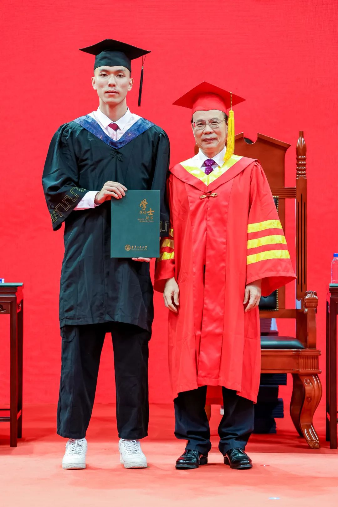 值得一提的是,今天参加仪式的毕业生中,有三位来自学校高水平男子篮球队,也是在刚刚结束的第25届中国大学生篮球一级联赛中勇夺全国总冠军的球员代表,他们分别是23号球员陈国豪、12号球员周泽源、15号球员刘康能。邱学青为他们授予学位,现场响起热烈的掌声和欢呼声。