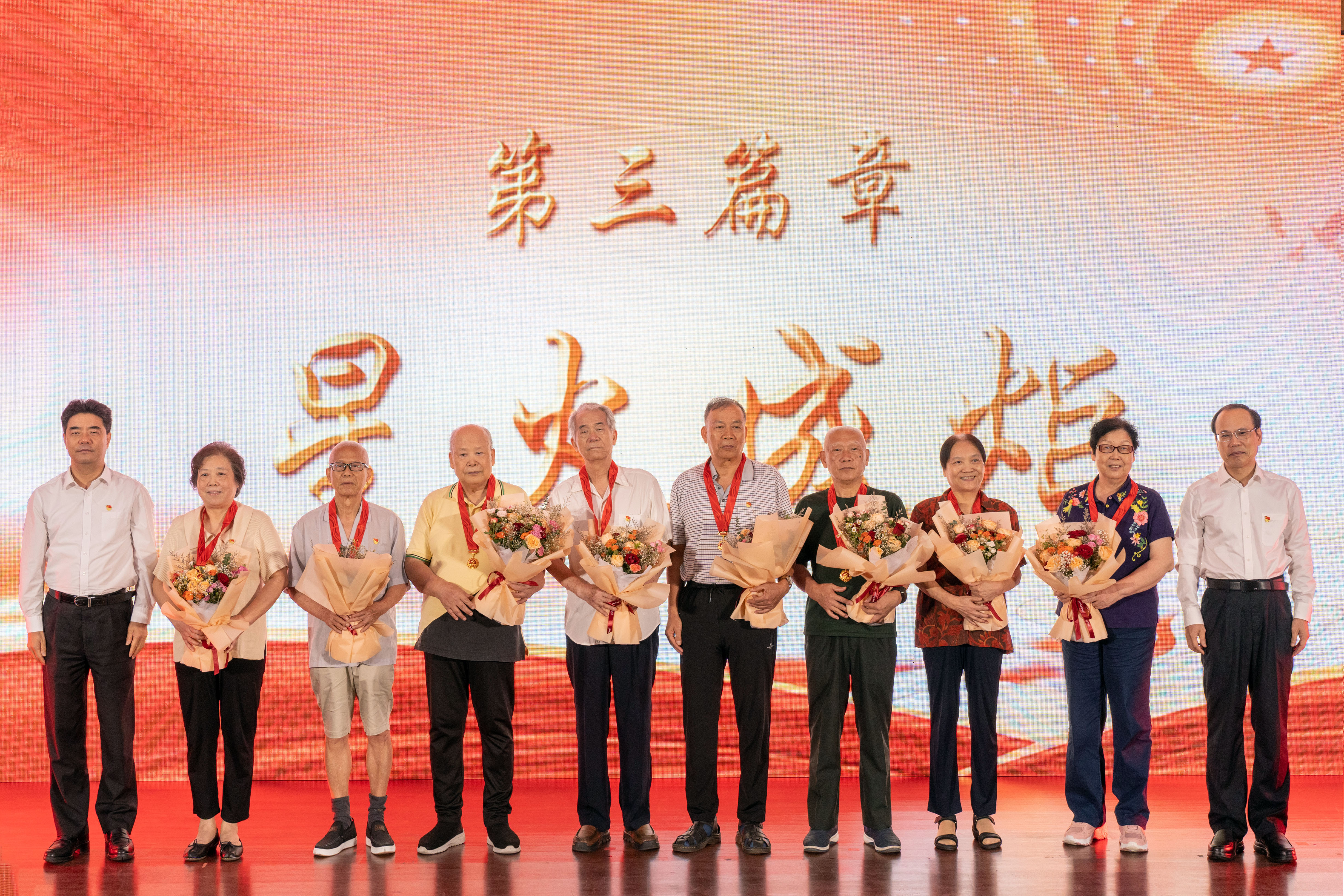 “点点星火、汇聚成炬,这就是中国力量!”广工本科办学65载,一代代广工人高唱接续奋斗的凯歌,党龄丈量了平凡的生命刻度,也成为了见证伟大的青春坐标。现场,学校党委书记胡钦太,党委副书记、校长邱学青为李遵松、梁日勤、黄安洋、陈秉照、傅建平、赵美玉、曾凡惠、周秀兰等8位老党员颁发“光荣在党50年”纪念章,学生党员为他们献上鲜花,致敬他们“满头白发风霜染,一片丹心映初心”的深厚爱党情怀和奉献精神。