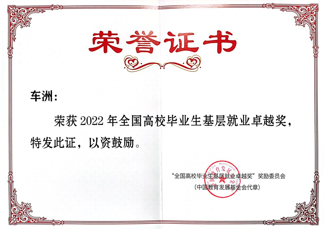 近日,教育部高校学生司印发《关于转发“全国高校毕业生基层就业卓越奖奖励委员会”〈关于公布2022年“全国高校毕业生基层就业卓越奖”获奖人选的通知〉的通知》。广工管理学院2017届人力资源管理专业毕业生车洲荣获首届“全国高校毕业生基层就业卓越奖”学生荣誉称号(全国共398名),这是对广工在基层就业并做出突出业绩的毕业生给予的充分肯定,也是对广工培养高素质、高质量人才的肯定。