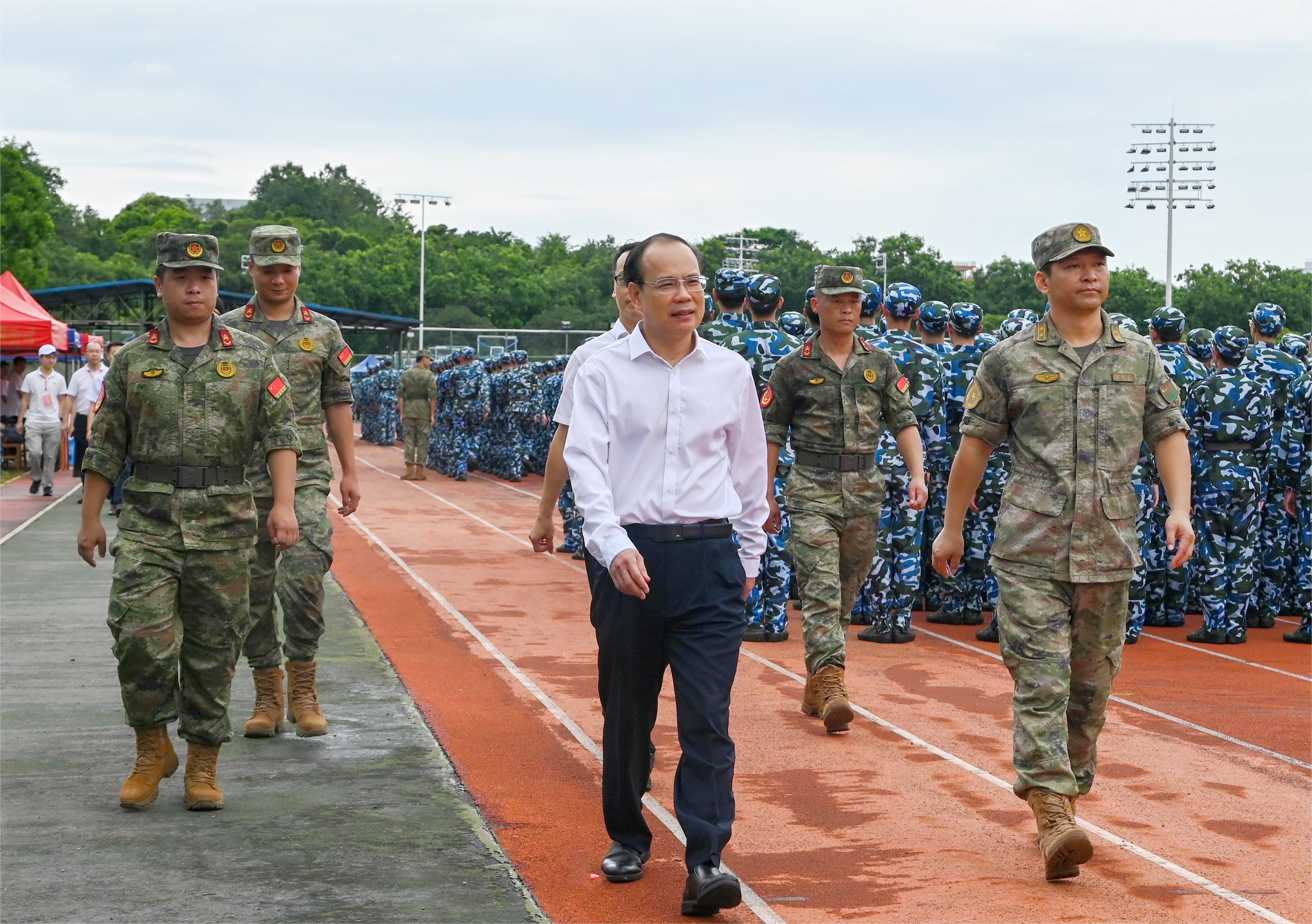 骄阳烈日磨心志,青春热血铸军魂。2023级学生军训已过半程,学校各部门齐心协力做好保障,教官认真负责、科学施训,学生斗志昂扬、刻苦训练,2023级本科生正在经历着青春的成长与蜕变。自军训工作开展以来,学校领导高度重视,党委书记胡钦太,党委副书记、校长邱学青,党委副书记陈卓武先后到训练场慰问指导,与各团营的教官、指导员亲切交流,了解军训进展以及同学们的训练情况。