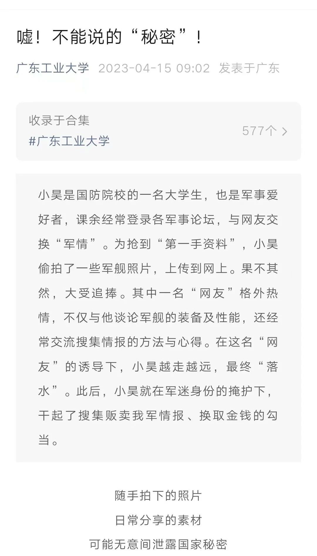 一是多维联动,五校区+线上线下开展保密宣传教育。在“4·15”全民国家安全教育日前后,学校依托校园宣传栏、微信公众号、校园电子屏等平台,宣传普及保密法律法规和保密知识,开展保密警示教育。保密委员会办公室联合党委宣传部,制作保密宣传教育展板34幅,在大学城、东风路、龙洞、番禺、揭阳五个校区同步展出;以保密宣传教育为主题,制作《嘘!不能说的“秘密”!》,并在安博手机网页版登录入口官方公众号推送。同时,在各校区食堂、学院等电子屏滚动播放保密宣教视频,转发主流媒体相关宣传内容,广泛动员广大师生通过“保密观”APP或者中国保密在线网站,参加保密线上培训,教育引导广大师生深化对国家安全理念和保密意识的认知。