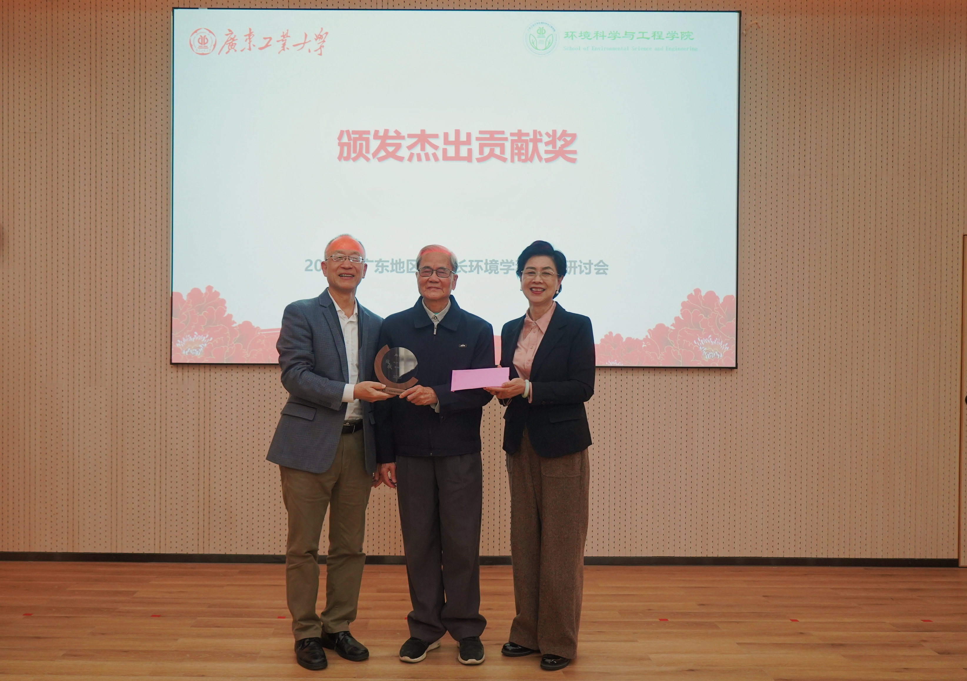 会议首次设立杰出贡献奖,94岁高龄的华南理工大学肖锦教授与中国科学院广州地球化学研究所盛国英教授当选。大会分别介绍了两位教授所取得的成就并为他们颁发了奖杯和奖金。