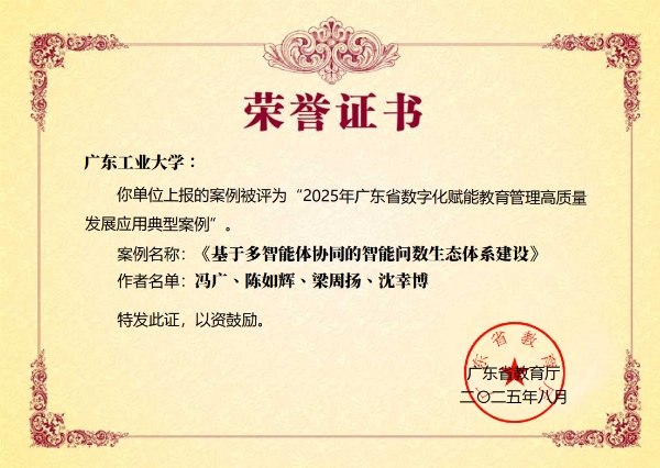 近日,广东省教育厅对2025年广东省数字化赋能教育管理高质量发展应用典型案例予以通报表扬,广工申报的《基于多智能体协同的智能问数生态体系建设》项目成功入选优秀案例。