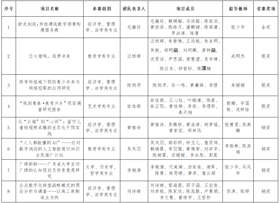 近日,2025年全国大学生新文科实践创新大赛广东省总决赛圆满落幕,本次大赛由广东省教育厅指导,广东省高等教育学会、华南农业大学主办,省内39所高校的219支队伍参加。经过现场作品陈述、PPT展示答辩环节,广工8支进入省赛的队伍表现出色,获得金奖1项、银奖3项、铜奖4项。