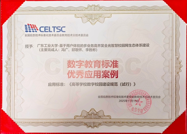 近日,在中国教育信息化技术标准大会年度会议上,我校的“基于用户体验的多业务高并发全光校园网生态体系建设”被评选为“2025年度数字教育标准优秀应用案例”。