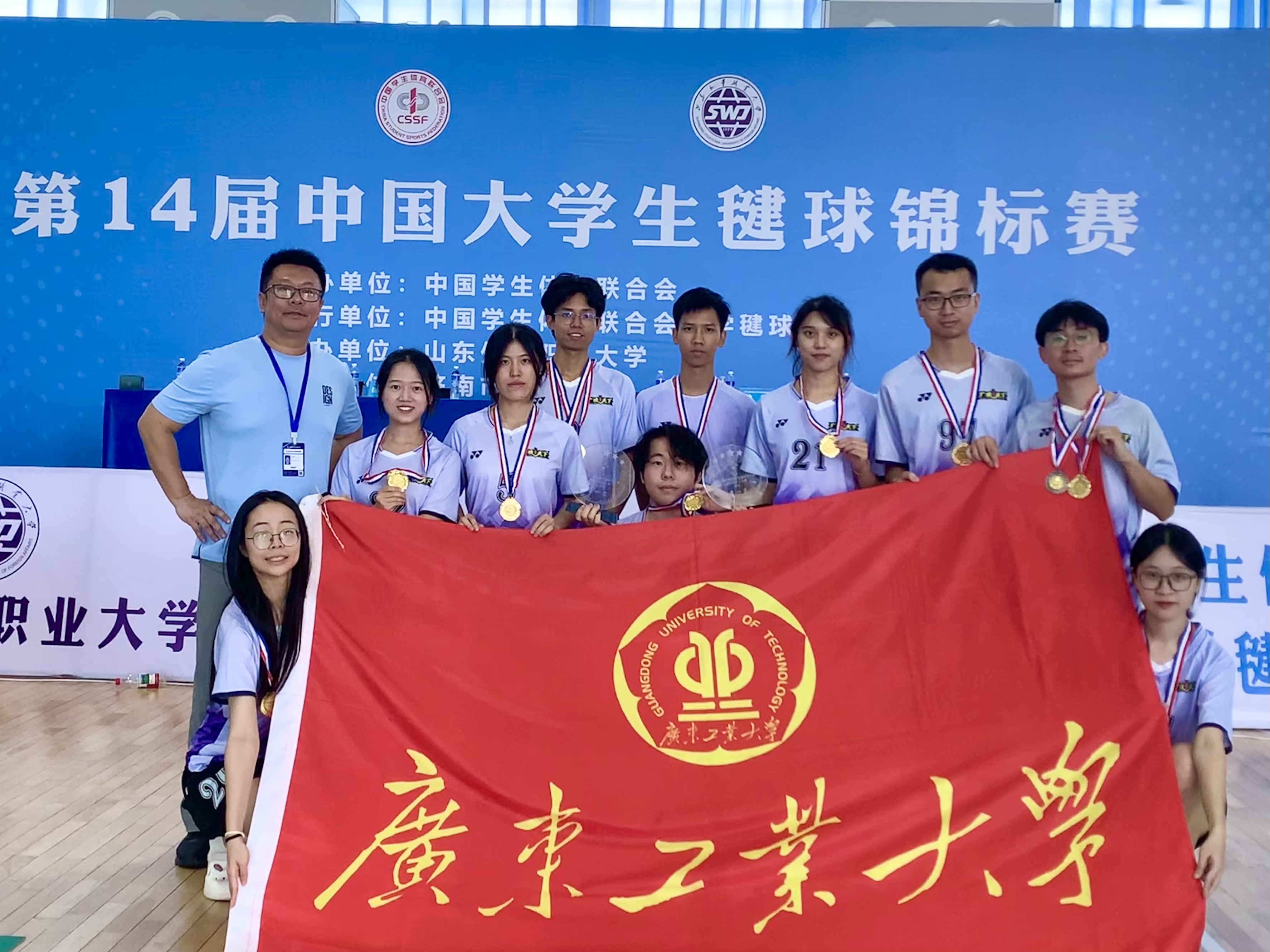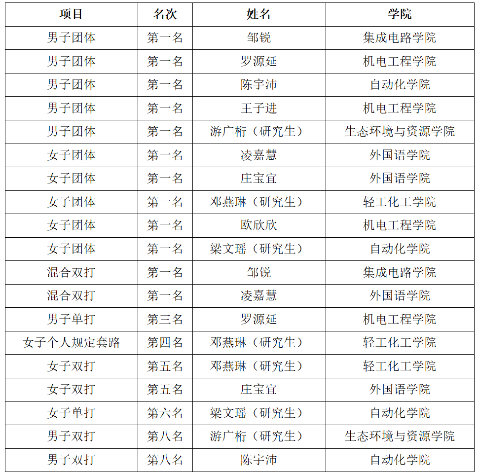广工代表队由肖徽样任领队,姚嘉和蔡玉燕任教练,派出10位队员参加比赛。经过连续6天的激烈比拼,全体队员凭借顽强的意志与稳定的发挥,一举夺得男子竞技团体、女子竞技团体、混合双人赛三项冠军,展示了广工学子在毽球项目上的强劲实力。