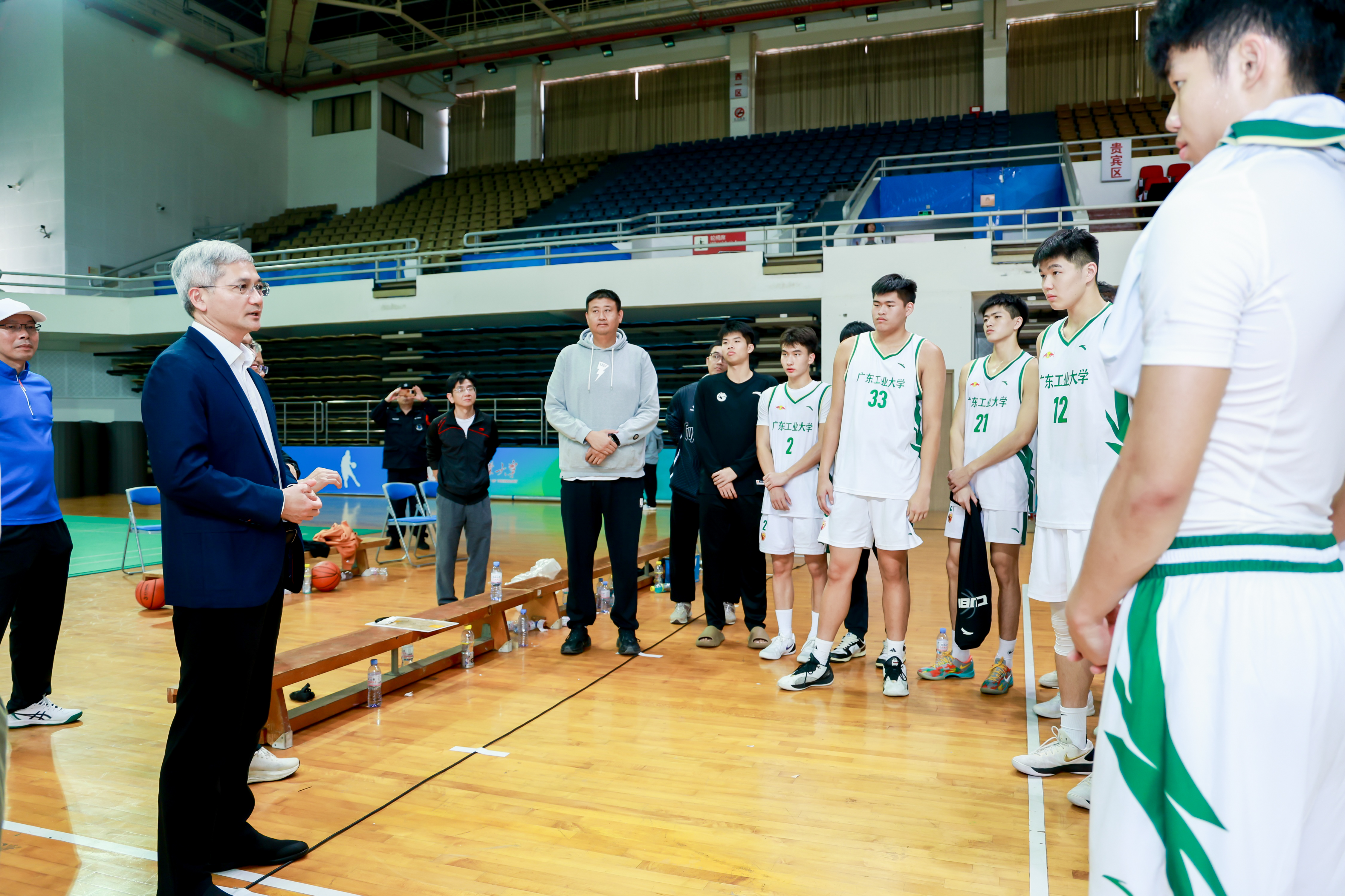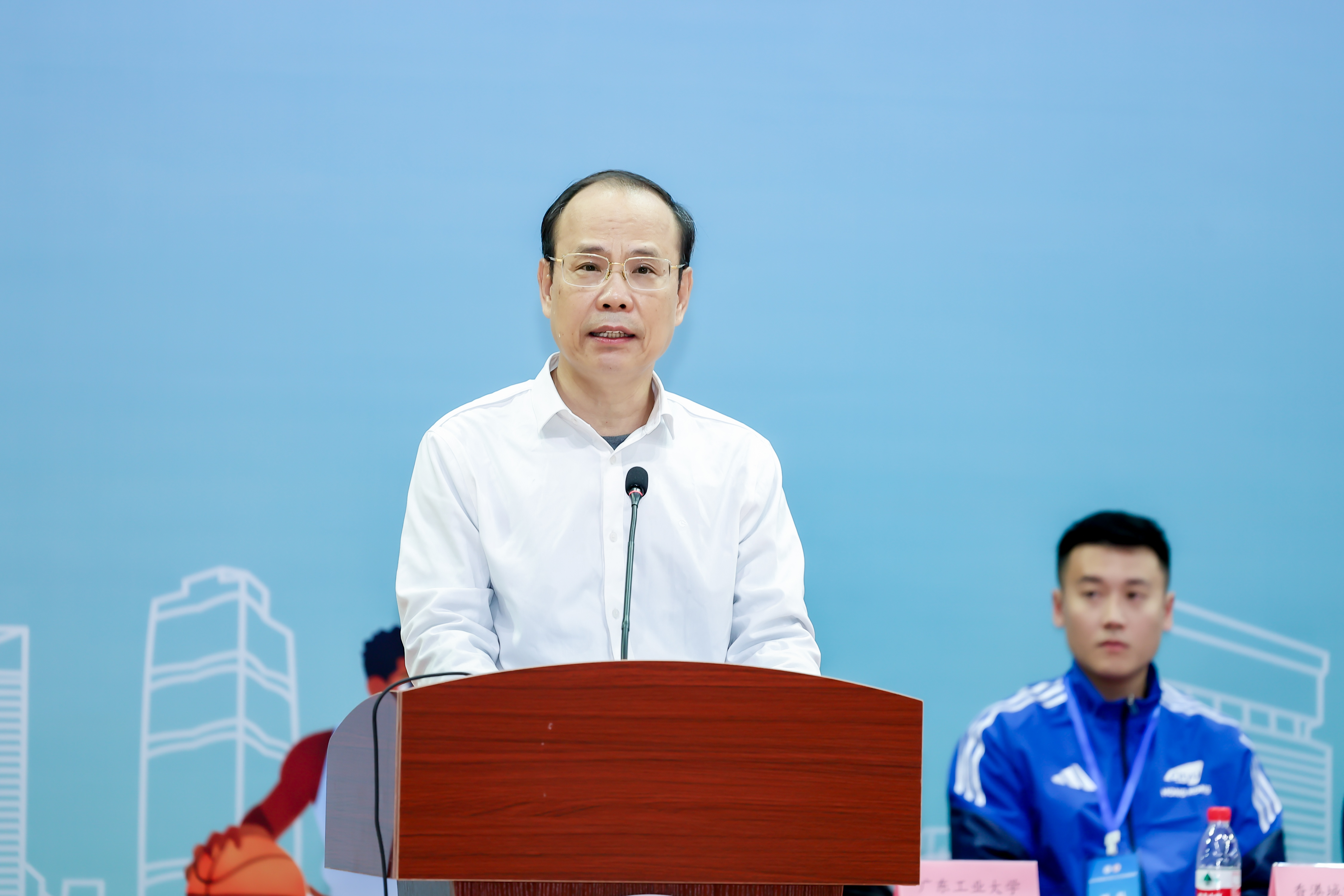 开幕仪式上,广工校长邱学青代表学校向参赛队伍表示热烈欢迎,向粤港澳高校联盟、广东省教育厅等支持单位表示感谢。他强调,学校深耕体教融合多年,形成了独具特色的“无篮球,不广工”校园文化。自1993年率先试办高水平运动队以来,培养出易建联、杜锋、朱芳雨、杨力维等一大批体坛名将,广工男篮常年稳居全国八强,2023年斩获第25届CUBAL一级联赛总冠军,用顽强拼搏的精神诠释了广工风采。如今,篮球已从校队专属项目变为全校共享的文化符号,成为联结师生、凝聚校友的重要载体。他指出,本次邀请赛是学校进一步推动粤港澳大湾区体育协同发展的生动实践。他希望三地青年学子,要以篮球为媒,在赛场上切磋技艺、增进友谊,在交流中凝聚共识、携手共进,将“同根同源、同心同行”的湾区精神融入每一次奔跑与拼搏,一起筑梦湾区,共绘“篮”图,“球”联四海,情系三地。广东省教育厅体育卫生与艺术教育处处长王静娴出席并宣布赛事开幕,粤港澳高校联盟秘书处、中山大学国际合作与交流处副处长余伯俊,前中国篮球运动员、CBA联赛总冠军六次获得者任骏飞,8所参赛高校运动队的代表以及广工相关单位负责人参加仪式。