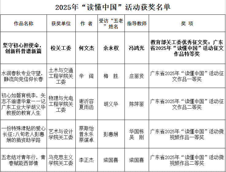 近日,教育部关工委与广东省教育系统关工委公布2025年“读懂中国”活动评审结果。广工关工委报送作品喜获佳绩:1篇征文入选教育部优秀作品,3篇征文分获省特等奖、一等奖、二等奖,2个微视频获省一等奖、二等奖;同时,我校获评教育部“表扬单位”和广东省“优秀组织奖”,实现奖项与荣誉双丰收。
