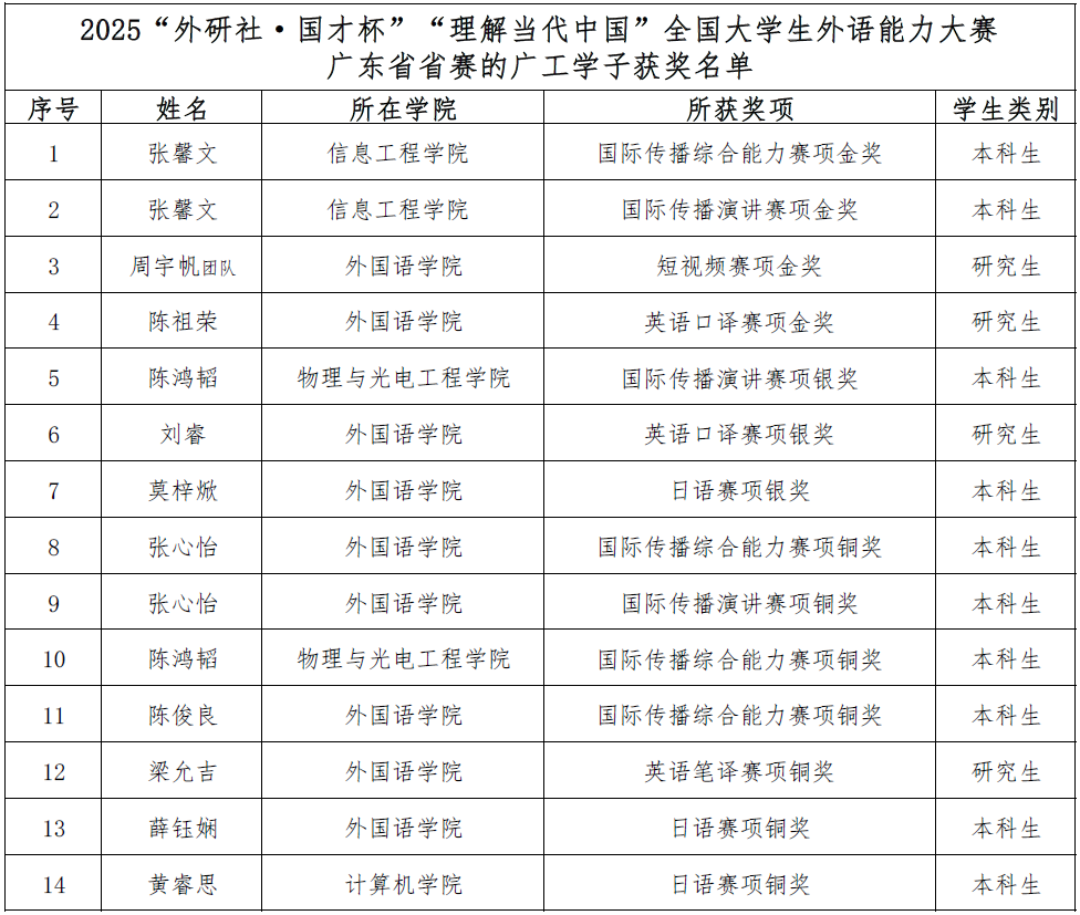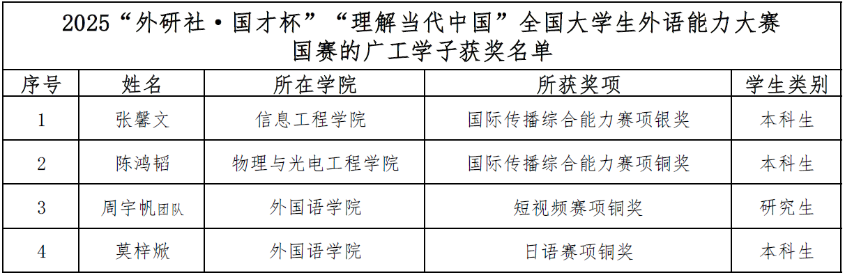广工学子在2025“外研社·国才杯”“理解当代中国”全国大学生外语能力大赛取得佳绩