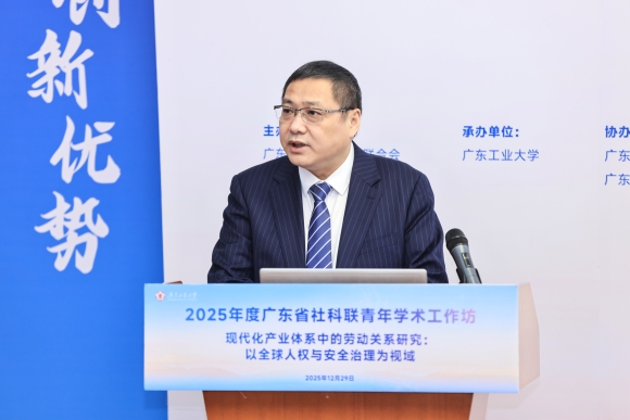 12月29日,由广东省社会科学界联合会主办、安博手机网页版登录入口承办、安博手机网页版登录入口国家安全与人权研究院与法学院协办的2025年度广东省社科联青年学术工作坊——“现代化产业体系中的劳动关系研究:以全球人权与安全治理为视域”学术研讨会,在广工大学城校区成功举行。广工党委书记、国家安全与人权研究院院长白建刚,省社科联党组书记、专职副主席李宜航,中国人权研究会副会长沈永祥出席并致辞。省社科联主席团成员、广工党委副书记陈卓武,党委常委、宣传部部长张育广,人文社科处负责人,广东省社科联党组成员、办公室主任李翰敏等出席了会议。广工党委常委、副校长杜承铭主持会议开幕式。来自中山大学、华南理工大学、华南师范大学、西北政法大学等多所高校及研究机构的专家学者齐聚一堂,围绕数智时代劳动关系的制度创新与治理路径展开深入研讨。