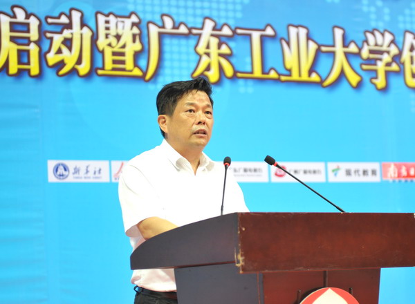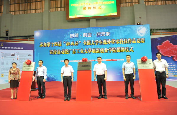 本网讯6月17日,团中央书记处书记傅振邦在省政府副秘书长林积、团省委书记曾颖如、副书记池志雄的陪同下莅临我校检查指导全国“挑战杯”竞赛筹备工作,并出席“第十四届‘挑战杯’全国大学生课外学术科技作品竞赛宣传启动暨创新创业学院揭牌仪式”。团中央学校部全国学联办公室主任柏贞尧、团中央学校部干部李天国,团省委学校部部长武一婷、香港科技大学协理副校长谭嘉因,我校校长陈新、校党委副书记米银俊、副校长张光宇、副校级干部张学理,教育科技先进典型、体育文化名人、合作企业高管、粤港高校师生代表,新华社、人民网、中国教育报、中国青年报、广东广播电视台、广州广播电视台、南方日报、羊城晚报、广州日报、南方都市报、信息时报、大公报等新闻媒体代表出席活动。仪式由张光宇主持。