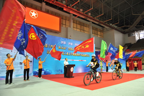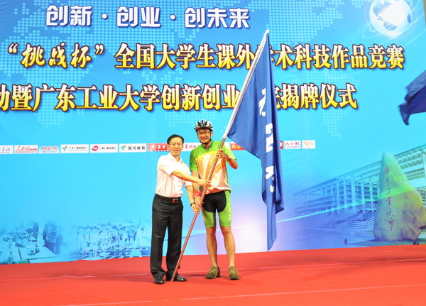池志雄向“挑战杯”竞赛骑行天下宣传队领队、广州齐天下教育科技有限公司董事长王卫授旗。这标志着竞赛大型骑行宣传活动正式启动。米银俊、张学理为我校创新创业训练基地揭牌。机电工程学院院长郭钟宁、建筑与城市规划学院院长朱雪梅与企业代表为我校首批大学生创新工作室揭牌。