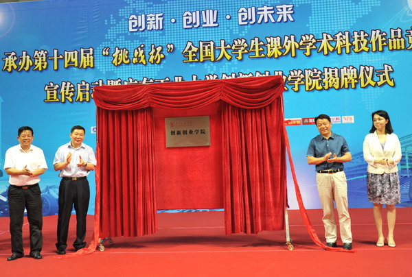 团中央书记处书记傅振邦(右二)、省政府副秘书长林积(左二)、团省委书记曾颖如(右一)、我校校长陈新(左一)为我校创新创业学院揭牌