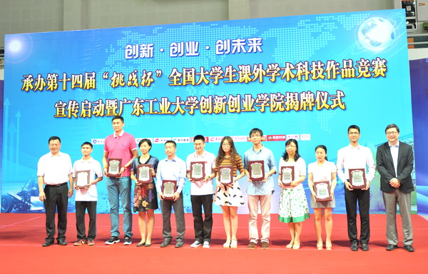 接着,举行“挑战杯”文化宣传使者聘任仪式。张学理、谭嘉因向10位新闻媒体、文化名人、企业与学生代表的“文化宣传大使”授牌。这标志着第十四届“挑战杯”国赛宣传正式全面启动。 “广东青年五四奖章”获得者,南方医科大学张镇海教授代表文化宣传大使上台发言,呼吁全社会各界人士和高校师生关注、支持“挑战杯”竞赛,关注、支持大学生科技创新活动。