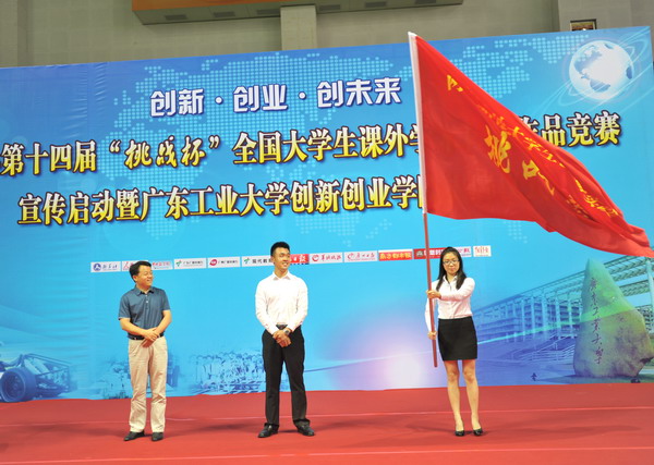 傅振邦、林积、曾颖如、陈新为我校创新创业学院揭牌。接着,傅振邦向学生代表第十三届全国“挑战杯”竞赛金奖获得者、我校学生何洁鑫,以及第十二届广东省“挑战杯”竞赛特等奖获得者、香港籍的暨南大学学生谢沅陶授旗。这标志着“两岸四地大学生创新实践‘挑战营’” 正式启动。首期营地活动将于今年7月份在粤港两地全面开展,届时将有来自13所承办过全国“挑战杯”竞赛的高校,12所广州地区高校共25名学生代表,以及来自港澳台高校的20名学生代表参加。