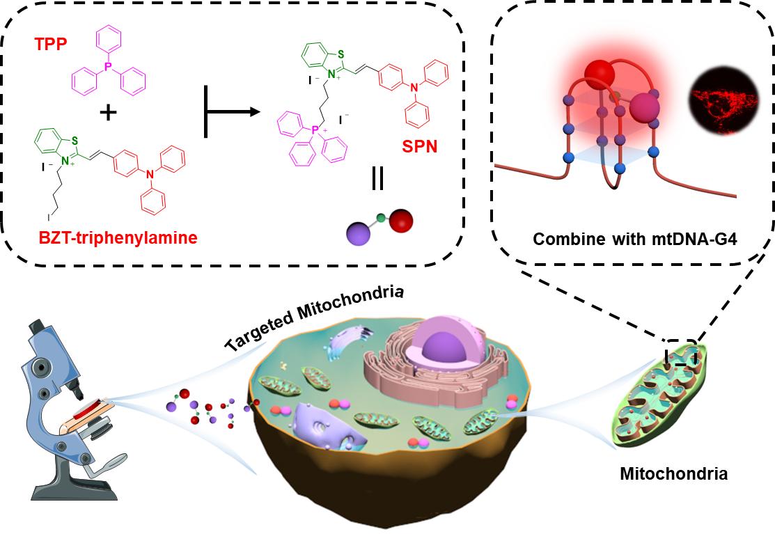 在《Chemical Engineering Journal》杂志发表题为“A smart small molecule as specific fluorescent probe for sensitive recognition of mitochondrial DNA G-Quadruplexes”(DOI: 10.1016/j.cej.2022.135977)的研究论文,针对mtDNA G4配体开发不足,现有配体灵敏度、选择性不佳的研究现状,开发了一种新型高灵敏性探针SPN,并初步将其用于肿瘤的选择性诊断。这项工作为mtDNA G4新型荧光配体的开发提供了一个新思路,同时也为mtDNA G4的形成动力学及其相关机制的研究提供了一种有力工具。该论文第一作者为2019级硕士生王亚坤,通讯作者为何燕副教授和刘旭杰副教授。