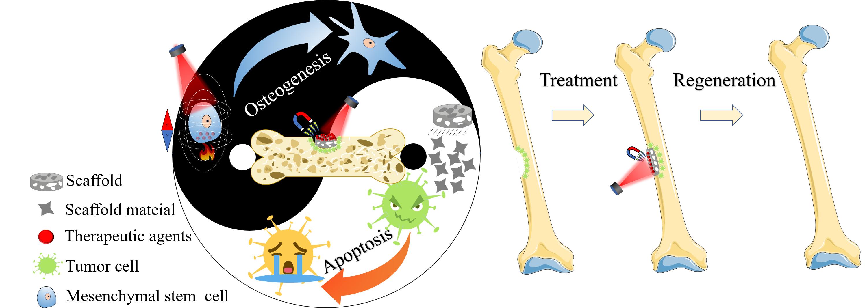 团队与清华大学材料学院冯庆玲教授合作,共同在《Materials Today Bio》杂志发表题为“Bifunctional scaffolds for tumor therapy and bone regeneration: Synergistic effect and interplay between therapeutic agents and scaffold materials”(DOI: 10.1016/j.mtbio.2022.100318)的综述论文,本综述总结了双功能支架在治疗应用和再生方面的最新研究进展。特别是总结了肿瘤治疗剂在骨再生中的作用和支架材料在肿瘤治疗中的作用;讨论了用于肿瘤治疗和骨再生的双功能支架的未来发展前景。该论文第一作者为2020级硕士生袁炯鹏,通讯作者为刘旭杰副教授、何燕副教授以及清华大学材料学院冯庆玲教授。