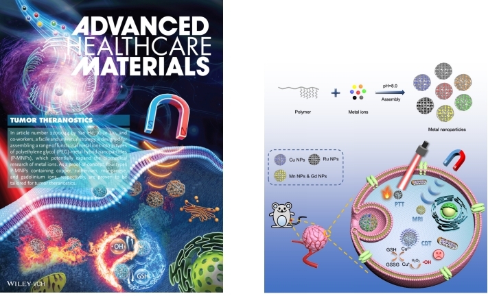 该团队在《Advanced Healthcare Materials》杂志上发表题为“A Facile and Universal Method for Preparing Polyethylene Glycol-Metal Hybrid Nanoparticles and Their Application in Tumor Theranostics”(DOI: 10.1002/adhm.202200044)的研究论文,提出了聚乙二醇(PEG)介导的金属离子转运的概念。将合成的高分子化合物作为金属载体,成功制备了31种金属杂化纳米粒子(P-MNPs),并将其成功用于肿瘤的体内外诊断和治疗。该研究成果为无机纳米材料的制备提供了一种可行的途径,并用于探索金属基纳米颗粒在生物医学领域的诊疗潜力。该论文第一作者为2021届硕士生陈泽丰和2020级硕士生曾耀勋,通讯作者为何燕副教授和刘旭杰副教授。