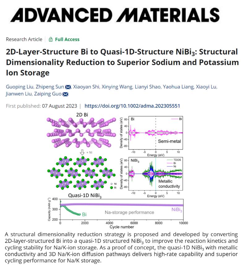 材料与能源学院孙志鹏教授团队最新研究成果“2D-Layer-Structure Bi to Quasi-1D-Structure NiBi3: Structural Dimensionality Reduction to Superior Sodium and Potassium Ion Storage”在材料科学领域国际顶级学术期刊《Advanced Materials》上发表。该期刊2022-2023年度最新影响因子为29.4,CiteScore为45.50。该论文安博手机网页版登录入口为第一完成单位,孙志鹏教授为通讯作者,博士研究生刘国平为第一作者(论文DOI: 10.1002/adma.202305551)。