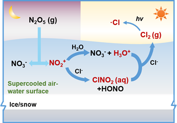 近年来关于对流层大气氯化学的研究发现,氯自由基具有极强的氧化性,能够快速氧化对流层中碳氢类有机污染物,从而影响大气中羟基自由基、过氧自由基和烷氧自由基的浓度,因此与对流层臭氧污染的发生密切相关,最终对对流层的大气氧化性、冬季二次污染物生成和人类生态系统的健康保护均具有重要影响。ClNO2是氯自由基和活性氮化物的重要来源,因此会影响大气的氧化性,并在全球氮循环和氯循环中起到重要作用。在寒冷地区,ClNO2主要来源于五氧化二氮(N2O5)在含氯冰/雪表面的非均相反应。因此,中美两国科学家结合多种理论化学算法,研究了ClNO2在过冷气-液界面的微观动力学转化过程及其对氯自由基的形成贡献机制,揭示了ClNO2与氯离子在酸化后的气-液界面的非均相化学反应机理,提出了N2O5水解产生的酸性离子是其快速产生活性氯的先决条件。该成果不仅有助于正确理解寒冷地区大气氯自由基的来源,更可以为大气氯化学反应对对流层大气氧化性、二次污染物形成和臭氧产生的贡献提供基础数据。