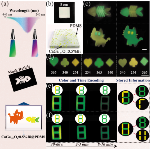 基于光学性能可调可控的长余辉发光材料在紫外光感知、信息显示与加密中极具应用价值。然而,在化学性质稳定的无机材料体系内实现单组份、多模态、色彩动态可调的长余辉发光面临艰巨挑战。研究团队基于缺陷工程的设计理念,通过非化学计量组分设计引入阳离子空位缺陷,在无机晶体结构中形成了多发光中心与多陷阱中心构成的微环境,这些微环境分别响应不同的激发光并将能量存储在局域结构中,最终通过热振动或隧穿效应逐渐释放能量并产生“橙黄绿”连续可调的余辉发光。结合实验与理论分析阐明了激发波长刺激响应的多色余辉机理。并利用材料特有的激发波长依赖的多色余辉特征,展示了基于激发方式、余辉颜色和时间分辨的动态光学信息读写与显示,所开发材料及验证方式揭示了其在先进防伪及光学信息显示与加密领域的应用潜力。
