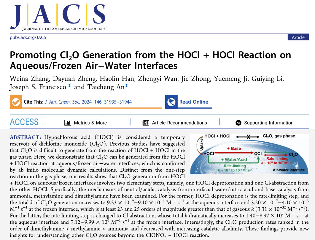 近日,我校环境健康与污染控制研究院、环境科学与工程学院安太成教授团队与美国宾夕法尼亚大学Joseph S. Francisco教授团队合作,在大气中一氧化二氯(Cl2O)形成机理方面取得重要进展。研究成果以“Promoting Cl2O Generation from the HOCl + HOCl Reaction on Aqueous/Frozen Air‒Water Interfaces”(https://pubs.acs.org/doi/10.1021/jacs.4c11337)为题,发表在Journal of the American Chemical Society (2024,146(46): 31935-31944)期刊上。论文的第一作者为张维娜副教授,通讯作者为安太成教授和Joseph S. Francisco教授,安博手机网页版登录入口为论文的第一单位。