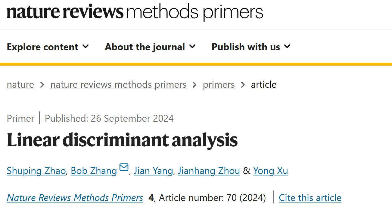 近日, 我校计算机学院(人工智能学院)赵淑平博士的论文“Linear Discriminant Analysis”发表于《Nature Reviews Methods Primers》(Nature子刊,影响因子 50.1),该论文也是以安博手机网页版登录入口为第一单位在该期刊发表的第一篇论文。《Nature Reviews Methods Primers》致力于加强跨学科的协作,旨在出版“生命科学和物质科学里有关分析、应用、统计、理论计算、模拟等方法或技术的权威综述”。安博手机网页版登录入口计算机学院赵淑平老师为该文章第一作者,通讯作者为澳门大学Bob Zhang教授,其他学者包括南京理工大学杨健教授、哈尔滨工业大学(深圳)徐勇教授以及日本大阪大学周健航研究员。