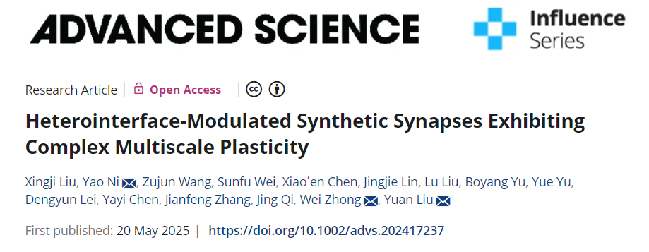 近日,我校集成电路学院刘远教授团队在国际著名综合类期刊Advanced Science(中科院一区,IF = 14.3)上发表题为“Heterointerface-Modulated Synthetic Synapses Exhibiting Complex Multiscale Plasticity”的论文,报道了团队在神经形态电子器件领域的重要突破。集成电路学院2023级硕士研究生刘兴纪为论文第一作者;倪尧博士(兼共同第一作者)、钟伟博士、刘远教授为论文共同通讯作者。