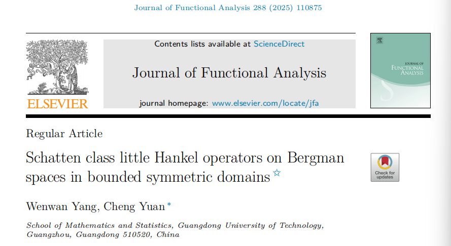 近期,我校数学与统计学院教师杨雯婉、袁程在“有界对称域上Bergman空间中的Schatten类小Hankel算子”研究中取得取得重要进展,研究成果以《Schatten class little Hankel operators on Bergman spaces in bounded symmetric domains》为题发表于国际著名学术期刊《Journal of Functional Analysis》。