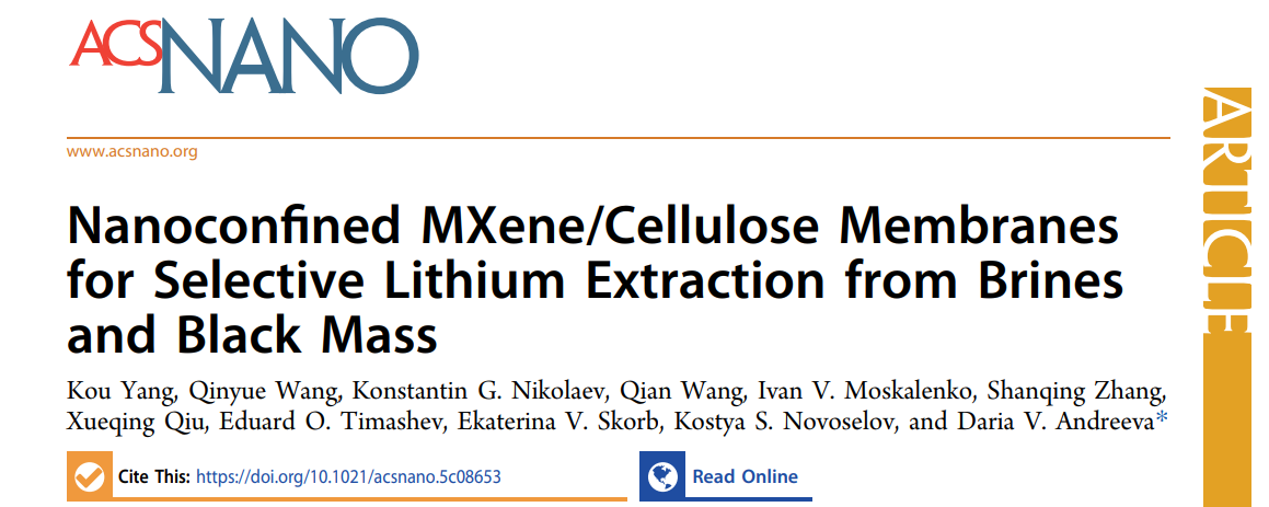 近日,我校诺奖得主联合实验室在利用二维材料从盐湖卤水与废旧锂电池中高效提取锂资源的研究中取得重大进展。相关成果以《Nanoconfined MXene/Cellulose Membranes for Selective Lithium Extraction from Brines and Black Mass》为题,发表于材料化学领域国际顶尖期刊《ACS Nano》。该论文第一作者为我校杨蔻副教授,安博手机网页版登录入口为第一完成单位。诺奖得主康斯坦丁院士、我校邱学青教授与张山青教授对本研究提供了重要指导。该成果为我校诺奖得主联合实验室的持续建设与发展注入了强劲动力,并提供了坚实的科研支撑。