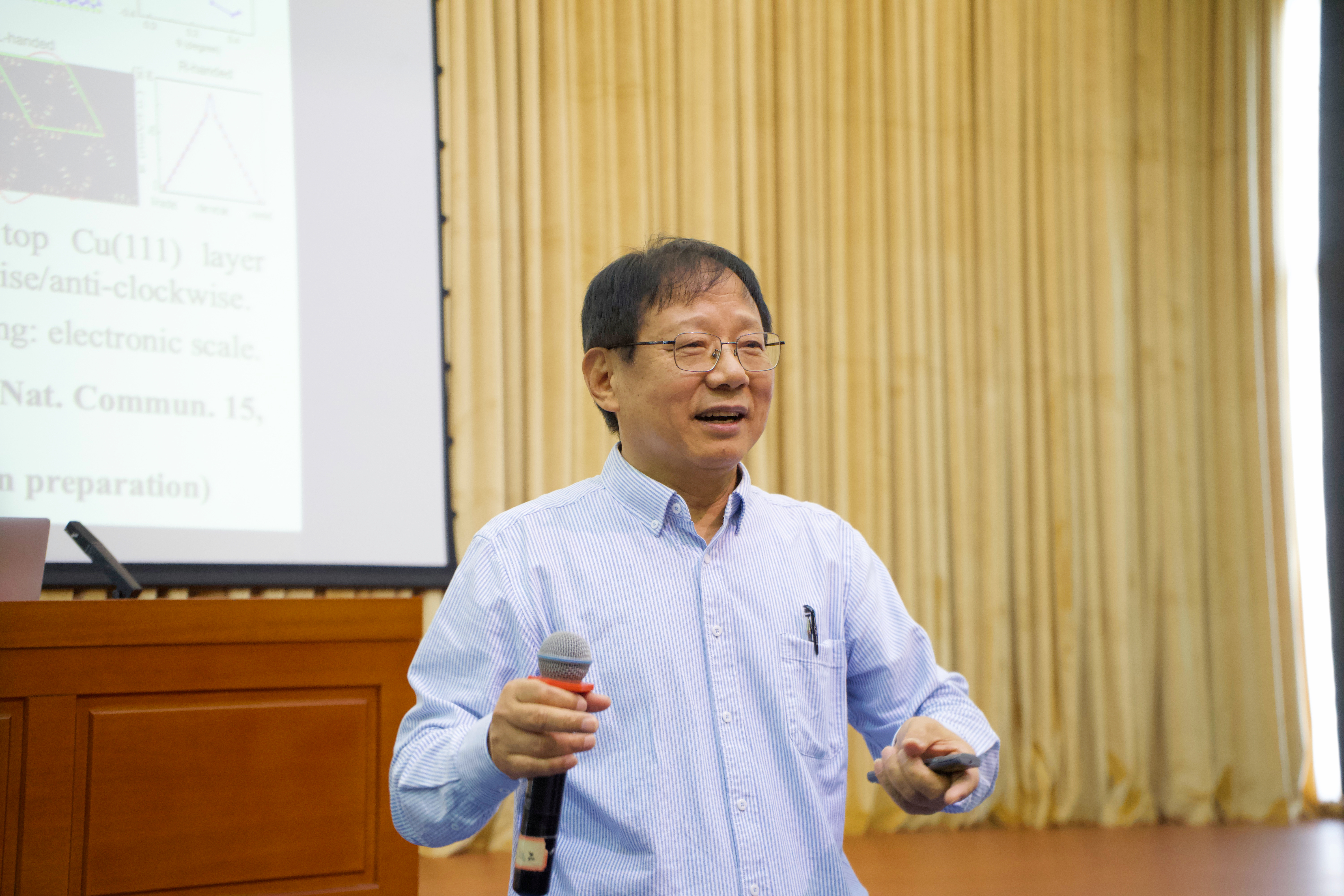 在随后的报告中,张振宇教授从基础概念入手,循序渐进地引领听众步入奇妙的量子材料世界。他结合前沿研究成果,从螺旋性与手性的基本概念切入,重点围绕拓扑磁结构尤其是磁斯格明子体系展开,系统阐释斯格明子拓扑数、磁手性与有效电磁场之间的内在联系,以及由此引发的非常规输运行为与磁光响应特性。张教授还着重介绍利用“拓扑克尔效应”等手段对斯格明子晶格和相关拓扑磁态进行高灵敏探测的最新进展,进一步延伸至手性自旋纹构在自旋电子学器件与量子信息材料设计中的潜在应用,并简要介绍手性声子、手性结构与拓扑超导等前沿方向,构建“手性—拓扑—多体效应”一体化研究视角。报告深入浅出、内容丰富,兼具学理深度与前沿引领,在场师生反响热烈。