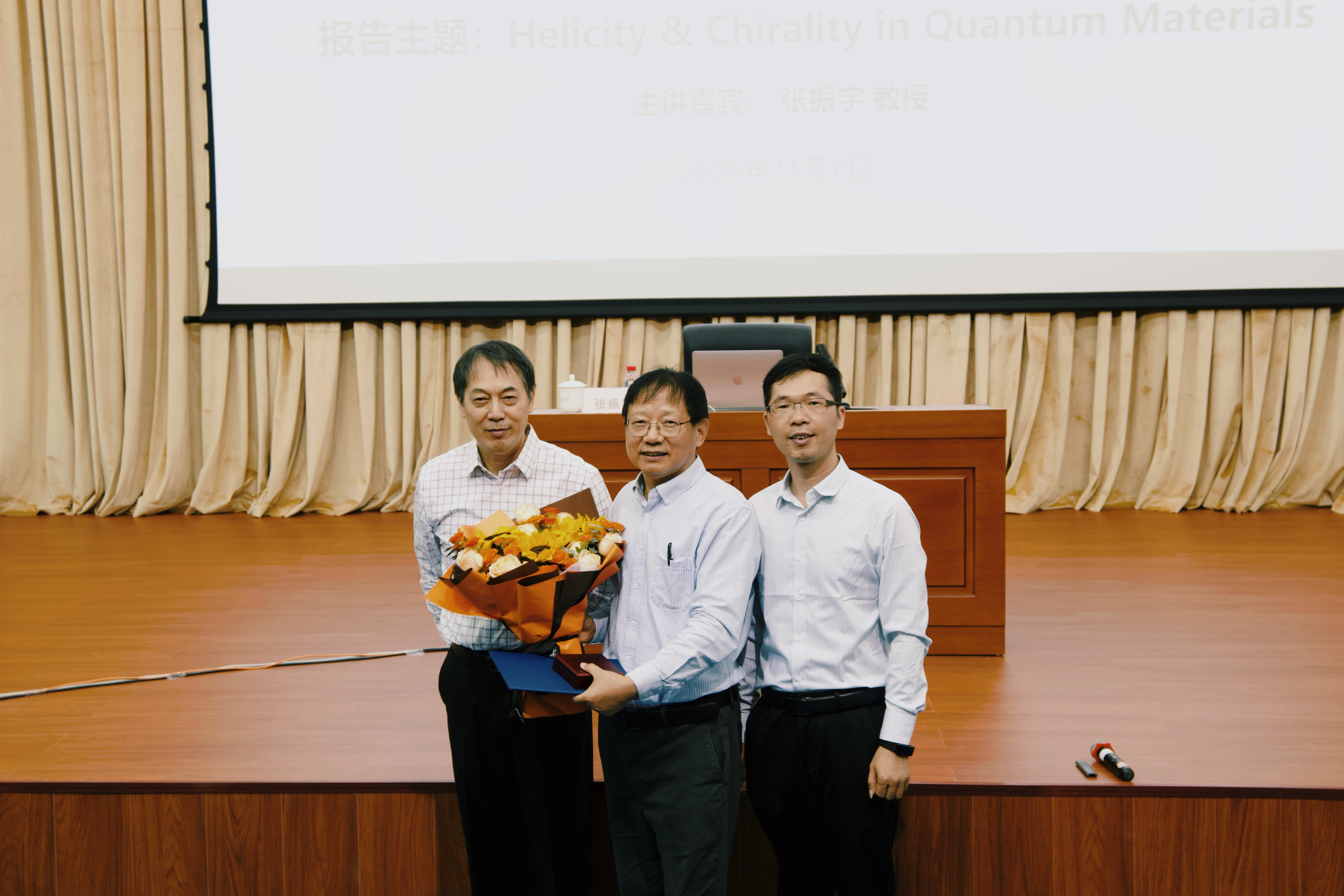 在讲座尾声,张教授从学生代表手中接过鲜花,并与在场全体师生合影留念。本场报告充分彰显了张教授深邃的学术洞察力,必将激励我校学子以更加昂扬的学术热情,在求知路上不断精进专业能力,为国家发展与社会进步贡献青春智慧。