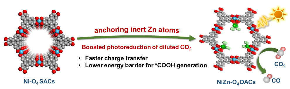 利用太阳能将二氧化碳(CO2),尤其是人为源的低浓度CO2直接转化为高附加值化学品(如CO),是应对能源和气候危机的理想方案。然而,C=O键的高解离能、受限的光生电荷分离效率,以及在低CO2浓度下其他组分的竞争吸附,导致CO2难以在催化剂表面吸附和活化,限制了反应的活性和选择性。研究团队成功构建了一种基于导电金属有机框架(CMOF)的镍-锌双原子催化剂(NiZn-O4 DACs),该催化剂利用惰性Zn位点与活性Ni位点的协同作用,实现了高效、高选择性光催化还原人为源低浓度CO2。当Ni/Zn比例为4:1时,NiZn-O4 DACs在纯CO2气氛中实现了20.17 μmol h-1的CO生成速率,选择性达到97%,优于镍单原子催化剂(Ni-O4 SACs)以及大多数已报道的体系。此外,在人为源低浓度CO2(10%)中,NiZn-O4 DACs的CO选择性仍能保持在94%,而Ni-O4 SACs的CO选择性则明显下降(从95%降至88%)。光电化学测试表明,Zn位点的引入促进了光生电子-空穴对的分离和迁移,提高了电荷分离与传输效率。理论计算结果进一步揭示,通过引入惰性的Zn位点,有效调节了邻近Ni活性中心的电子结构,加速了电子转移,提升了还原动力学,显著降低了形成关键中间体*COOH所需的能垒。这项工作深入阐明了DACs中惰性金属位点与活性位点之间的协同作用机制,为开发适用于特定应用场景的高效DACs提供了理论依据与参考。