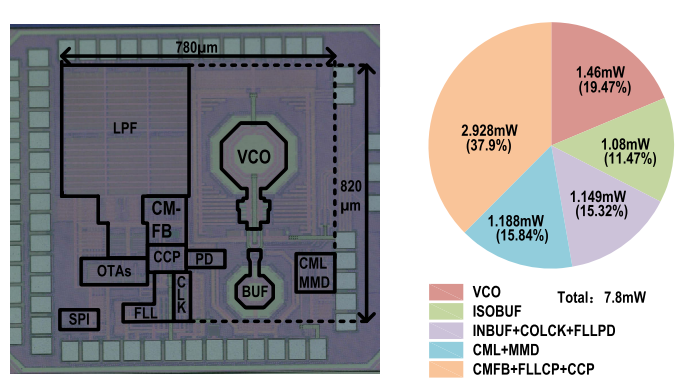 此外,团队还配套设计了一款高摆幅class-C/F₂电压控制振荡器(VCO),利用差模与共模阻抗调谐策略进一步优化了带外噪声,实现了功耗与噪声性能的极佳平衡。测试结果显示,该SS-CPLL芯片在65-nm CMOS工艺下实现了49.9fs的极低集成抖动,带内相位噪声在1-kHz偏移下低至-111.9dBc/Hz,品质因数(FoM)达到-257.1dB,而总功耗仅为7.8mW。
