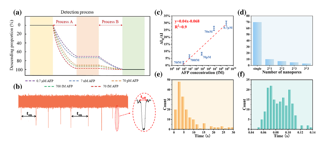 针对上述难题,在广东省重点领域研发计划项目(四代纳米孔测序仪及配套病原微生物检测试剂的研制,No.2023B0101200014)和国自然项目(氮化硅埃米孔制造及传感研究,No.52575480)等项目资助下,开展纳米孔阵列结构设计与可控制造研究。提出Al₂O₃/Au/Si₃N₄纳米孔三明治阵列芯片,利用该纳米孔三明治结构中的Al₂O₃、Au、Si₃N₄与抗体官能团之间结合力的差别实现抗体修饰位置主动精准控制,进而解决抗体修饰位置问题。通过MEMS工艺与氦离子束极端制造方方法,实现Al₂O₃/Au/Si₃N₄纳米孔三明治阵列芯片可控制造,并在此基础上实现了fM级甲胎蛋白AFP 的精确检测。