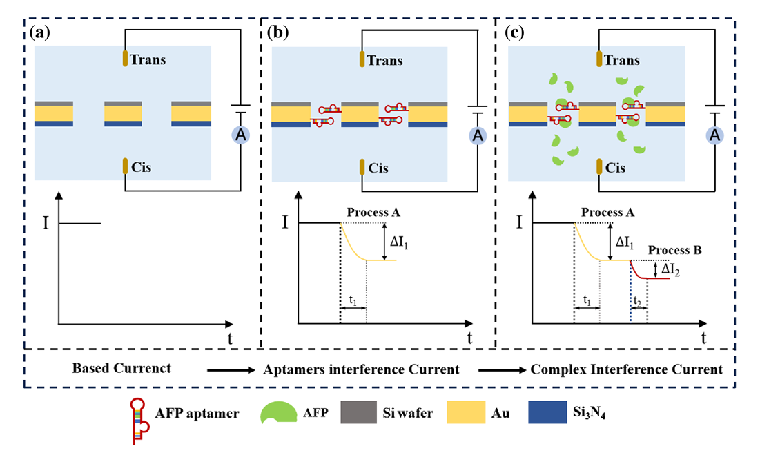 Al₂O₃/Au/Si₃N₄纳米孔三明治阵列芯片AFP定量检测原理图