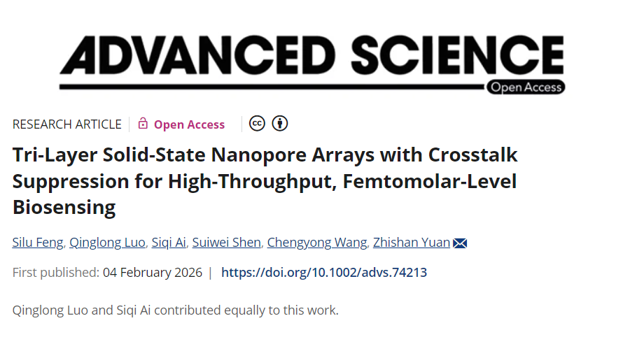 以上工作以题为“Tri-Layer Solid-State Nanopore Arrays with Crosstalk Suppression for High-Throughput, Femtomolar-Level Biosensing”于TOP期刊《Advanced Science》(Q1, IF=14.1)上发表。IMT团队成员集成电路学院冯思路副教授、24级研究生罗青龙、机电工程学院19级研究生艾思琪、21级研究生沈穗伟、以及团队学术带头人王成勇教授为共同作者,袁志山教授为通讯作者。