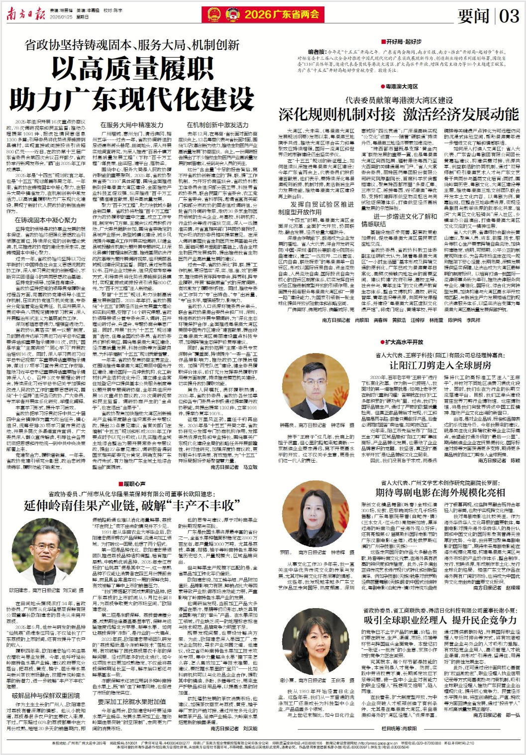 编者按:今年是“十五五”开局之年。广东省两会期间,南方日报、南方+推出“开好局·起好步”专栏,对标省委十三届八次全会对推进中国式现代化的广东实践展现新作为、创造新业绩的系列谋划部署,围绕省委“1310”具体部署,邀请代表委员就粤港澳大湾区、扩大高水平开放、增强内需主动力等10个主题建言献策,为广东“十五五”开好局起好步贡献力量。敬请关注。